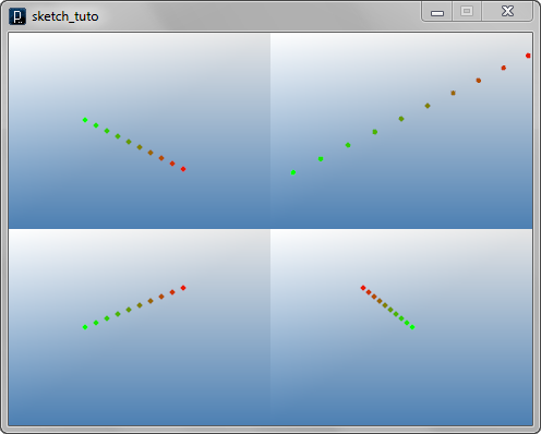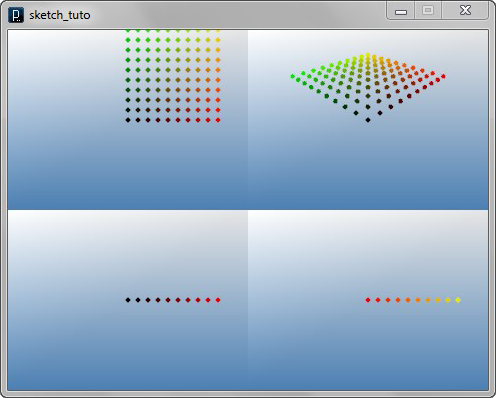import processing.opengl.*; import igeo.*; size( 480, 360, IG.GL ); new IPoint(-50, 10, 0).clr( 0, 1.0, 0); // i=0 new IPoint(-40, 5, 4).clr(0.1, 0.9, 0); // i=1 new IPoint(-30, 0, 8).clr(0.2, 0.8, 0); // i=2 new IPoint(-20, -5, 12).clr(0.3, 0.7, 0); // i=3 new IPoint(-10, -10, 16).clr(0.4, 0.6, 0); // i=4 new IPoint( 0, -15, 20).clr(0.5, 0.5, 0); // i=5 new IPoint( 10, -20, 24).clr(0.6, 0.4, 0); // i=6 new IPoint( 20, -25, 28).clr(0.7, 0.3, 0); // i=7 new IPoint( 30, -30, 32).clr(0.8, 0.2, 0); // i=8 new IPoint( 40, -35, 36).clr(0.9, 0.1, 0); // i=9