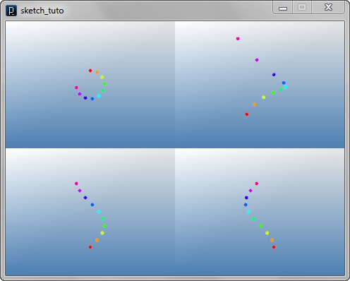 import processing.opengl.*; import igeo.*; size( 480, 360, IG.GL ); for( int i=0; i < 10; i++){ new IPoint(sin(i*0.5)*20, cos(i*0.5)*20, i*10-50).hsb(i*0.1,1,1); }