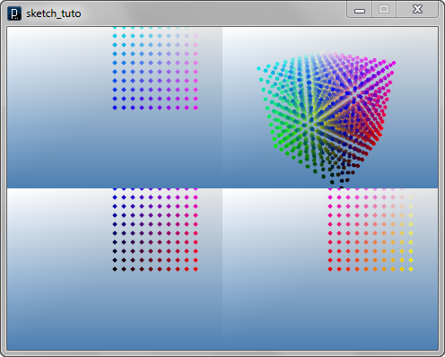 import processing.opengl.*; import igeo.*; size( 480, 360, IG.GL ); for(int i=0; i < 10; i++){ for(int j=0; j < 10; j++){ for(int k=0; k < 10; k++){ new IPoint(i*10, j*10, k*10).clr(i*0.1, j*0.1, k*0.1); } } }