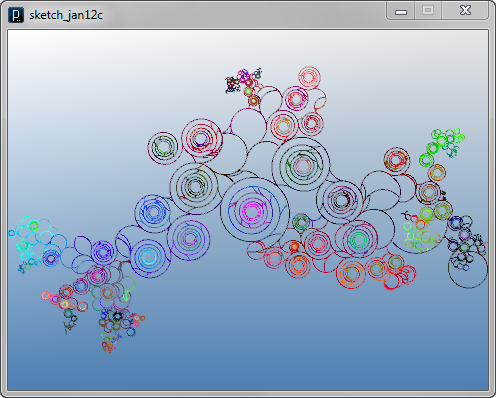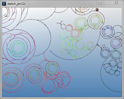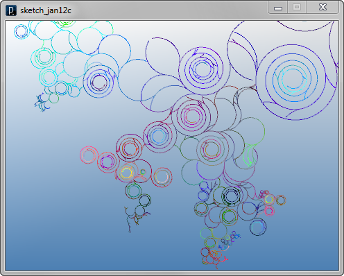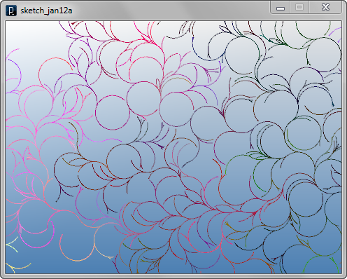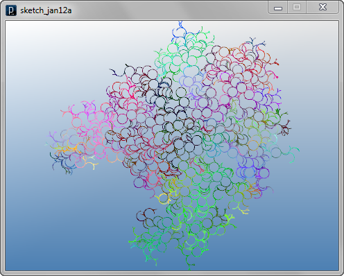 import processing.opengl.*; import igeo.*; void setup() { size(480, 360, IG.GL); IG.duration(400); // left 100%, right 4.5% new LineAgent(IG.v(0,0,0), IG.v(2,0,0), 100.0, 4.5).clr(0); } static class LineAgent extends IAgent{ IVec pos; IVec dir; double pctL, pctR; boolean isColliding=false; LineAgent(IVec pt, IVec dir, double pctL, double pctR) { pos = pt; this.dir = dir; this.pctL = pctL; this.pctR = pctR; } public void interact(ArrayListagents){ if(time()==0){ for(int i=0; i < agents.size() && !isColliding ; i++){ if(agents.get(i) instanceof LineAgent){ LineAgent a = (LineAgent)agents.get(i); if(a != this){ IVec pos2 = pos.cp(dir); IVec apos2 = a.pos.cp(a.dir); if(!apos2.eq(pos) && !a.pos.eq(pos) && //not sharing root IVec.intersectLine(a.pos,apos2,pos,pos2)!=null){ //intersecting isColliding=true; } } } } } } public void update() { if(time()==0){ if(isColliding){ del(); return; } IVec pos2 = pos.dup().add(dir); new ICurve(pos, pos2).clr(clr()); double r = red() + IRand.get(-0.05, 0.05); double g = green() + IRand.get(-0.05, 0.05); double b = blue() + IRand.get(-0.05, 0.05); boolean branchL = IRand.pct(pctL); boolean branchR = IRand.pct(pctR); double lenL = dir.len(); double lenR = dir.len(); lenL*=0.995; //shrinking length lenR*=0.995; //shrinking length if (branchL && branchR) { //only when branching both if(IRand.pct(50.0)){ if (pctL < pctR) { lenL *= 0.9; } else{ lenR *= 0.9; } } else if(IRand.pct(6.0)){ if (pctL < pctR) { lenL *= 0.4; } else{ lenR *= 0.4; } } else if(IRand.pct(5.0)){ if (pctL < pctR) { lenL *= 4.0; } else{ lenR *= 4.0; } } } if (branchL) { //bend left IVec dir2 = dir.dup(); dir2.len(lenL); //update length dir2.rot(PI/30); if(branchR && pctR > pctL){//swap L/R% when branching both new LineAgent(pos2, dir2, pctR, pctL).clr(r,g,b); } else{ new LineAgent(pos2, dir2, pctL, pctR).clr(r,g,b); } } if (branchR) { //bend right IVec dir2 = dir.dup(); dir2.len(lenR); //update length dir2.rot(-PI/30); if(branchL && pctR < pctL){//swap L/R% when branching both new LineAgent(pos2, dir2, pctR, pctL).clr(r,g,b); } else{ new LineAgent(pos2, dir2, pctL, pctR).clr(r,g,b); } } } } }