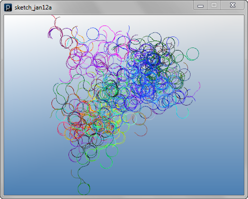 import processing.opengl.*; import igeo.*; void setup() { size(480, 360, IG.GL); IG.duration(700); // left 99.0%, right 1.5% new LineAgent(IG.v(0,0,0), IG.v(2,0,0), 99.0, 1.5).clr(0); } static class LineAgent extends IAgent{ IVec pos; IVec dir; double pctL, pctR; LineAgent(IVec pt, IVec dir, double pctL, double pctR) { pos = pt; this.dir = dir; this.pctL = pctL; this.pctR = pctR; } public void update() { if(time()==0){ //putting line geometry IVec pos2 = pos.dup().add(dir); new ICurve(pos, pos2).clr(clr()); double r = red() + IRand.get(-0.05, 0.05); double g = green() + IRand.get(-0.05, 0.05); double b = blue() + IRand.get(-0.05, 0.05); if(IRand.pct(3.0)){ //swap L/R percent double tmp = pctL; pctL = pctR; pctR = tmp; } if (IRand.pct(pctL)) { //bend left IVec dir2 = dir.dup(); dir2.rot(PI/30); new LineAgent(pos2, dir2, pctL, pctR).clr(r,g,b); } if (IRand.pct(pctR)) { //bend right IVec dir2 = dir.dup(); dir2.rot(-PI/30); new LineAgent(pos2, dir2, pctL, pctR).clr(r,g,b); } del(); } } }