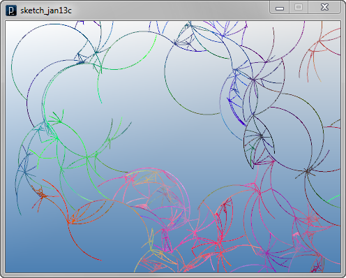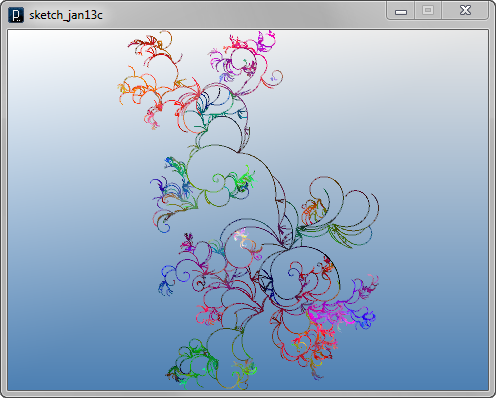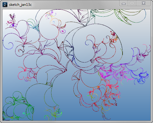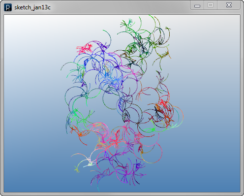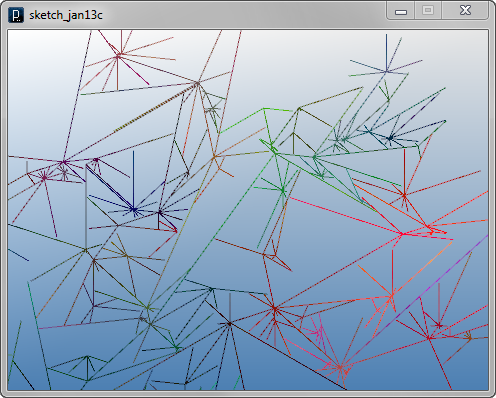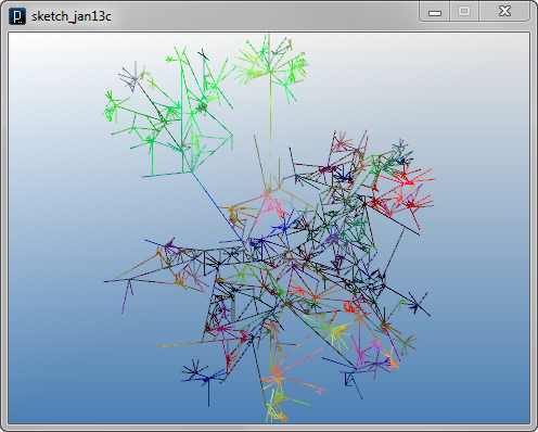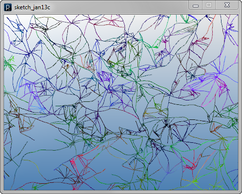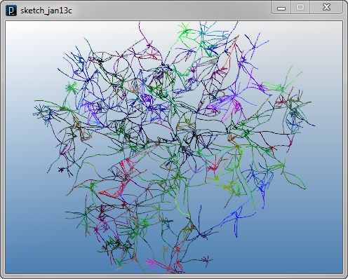 import processing.opengl.*; import igeo.*; void setup(){ size(480, 360, IG.GL); IG.duration(300); new LineAgent(new IVec(0,0,0), new IVec(0,1,0)).clr(0); } static class LineAgent extends IAgent{ IVec pt1, pt2; boolean isColliding=false; LineAgent(IVec pt, IVec dir){ pt1 = pt; pt2 = pt.cp(dir); } void interact(ArrayList< IDynamics > agents){ if(time == 0){ //only in the first time for(int i=0; i < agents.size() && !isColliding; i++){ if(agents.get(i) instanceof LineAgent){ LineAgent a = (LineAgent)agents.get(i); // checking clearance of end point if(!pt1.eq(a.pt1) && !pt1.eq(a.pt2) && IVec.intersectLine(pt1,pt2,a.pt1,a.pt2)!=null){ isColliding=true; } } } } } void update(){ if(isColliding){ del(); } else if(time == 0){ //if not colliding new ICurve(pt1,pt2).clr(clr()); IVec dir = pt2.dif(pt1); double r = red() + IRand.get(-0.06,0.06); double g = green() + IRand.get(-0.06,0.06); double b = blue() + IRand.get(-0.06,0.06); if(IRand.pct(2.5)){ //branching int num = 15; for(int i=1; i < num; i++){ if(IRand.pct(40)){ IVec dir2 = dir.dup().rev(); dir2.rot(2*PI*i/num); new LineAgent(pt2,dir2).clr(r,g,b); } } } else if(IRand.pct(99)){ //bending dir.rot(PI/80); new LineAgent(pt2,dir).clr(r,g,b); } } } }
