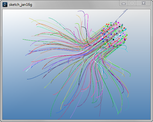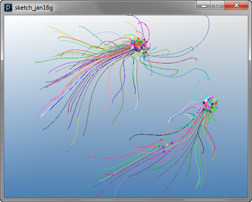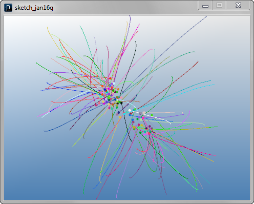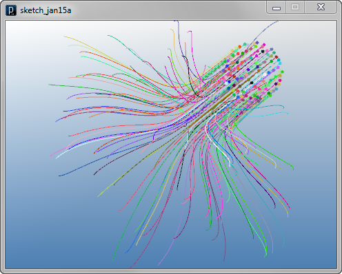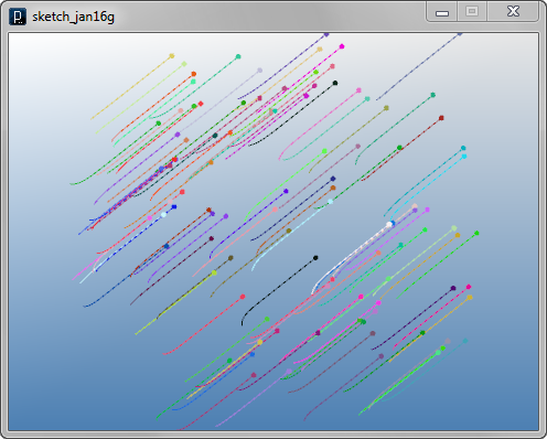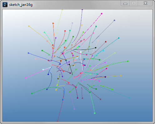 add_library('igeo') def setup() : size(480, 360, IG.GL) IG.duration(800) for i in range(100) : b = MyBoid(IRand.pt(100,100,0),IRand.pt(-5,-5,0,20,20,0)) b.clr(IRand.clr()) b.cohesionDist(30) b.cohesionRatio(5) b.separationDist(50) b.separationRatio(5) b.alignmentDist(40) b.alignmentRatio(5) class MyBoid(IBoid) : def __init__(self, p, v) : IParticle.__init__(self,p,v) self.prevPos = None def update(self) : #drawing line curPos = self.pos().cp() if self.prevPos is not None : IG.crv(self.prevPos, curPos).clr(self.clr()) self.prevPos = curPos