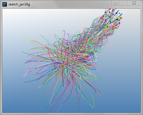 add_library('igeo') def setup() : size(480, 360, IG.GL) IG.duration(150) for i in range(100) : b = MyBoid(IRand.pt(100,100,0),IRand.pt(-5,-5,0,20,20,0)) b.clr(IRand.clr()) b.cohesionDist(50) b.cohesionRatio(5) b.separationDist(30) b.separationRatio(5) b.alignmentDist(40) b.alignmentRatio(5) class MyBoid(IBoid) : def __init__(self, p, v) : IParticle.__init__(self,p,v) self.prevPos = None def update(self) : #drawing line curPos = self.pos().cp() if self.prevPos is not None : IG.crv(self.prevPos, curPos).clr(self.clr()) self.prevPos = curPos