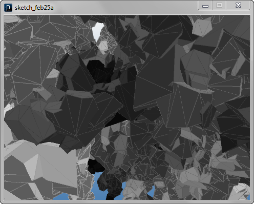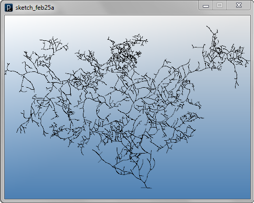 import igeo.*; import processing.opengl.*; void setup() { size(480, 360, IG.GL); IG.duration(120); new MyAgent(IG.v(0, 0, 0), IG.v(1, 0, 0)).clr(0); } class MyAgent extends IAgent { IVec pt1, pt2; boolean isColliding=false; MyAgent(IVec pos, IVec dir) { pt1 = pos; pt2 = pos.cp(dir); } void interact(ArrayList < IDynamics > agents) { for (int i=0; i < agents.size() && !isColliding; i++) { if (agents.get(i) instanceof MyAgent) { MyAgent agent = (MyAgent)agents.get(i); if (agent != this) { double dist = agent.pt2.dist(pt2); //distance of end points double tolerance = 0.5; //smaller number allows more collision if (dist < pt1.dist(pt2)*tolerance) { isColliding = true; } } } } } void update() { if (isColliding) { del(); } else if (time()==0) { new ICurve(pt1, pt2).clr(clr()); if (IRand.pct(95)) { //branch 1 IVec dir = pt2.dif(pt1); double angle = IRand.get(-PI/6, PI/6); dir.rot(IG.zaxis, angle); double scale = IRand.get(0.90, 1.08); dir.mul(scale); new MyAgent(pt2.cp(), dir).clr(clr()); } if (IRand.pct(50)) { //branch 2 IVec dir = pt2.dif(pt1); double angle = IRand.get(-PI/3*2, PI/3*2); dir.rot(IG.zaxis, angle); double scale = IRand.get(0.90, 1.08); dir.mul(scale); new MyAgent(pt2, dir).clr(clr()); } } } }