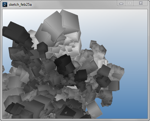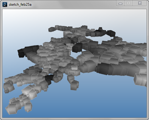 import igeo.*; import processing.opengl.*; void setup() { size(480, 360, IG.GL); IRand.init(2); IG.duration(40); new MyAgent(IG.v(0, 0, 0), IG.v(1, 0, 0), IG.v(0, 0, 1)).clr(0.5); } class MyAgent extends IAgent { IVec pt1, pt2, axis; boolean isColliding=false; MyAgent(IVec pos, IVec dir, IVec ax) { pt1 = pos; pt2 = pos.cp(dir); axis = ax; } void interact(ArrayList < IDynamics > agents) { for (int i=0; i < agents.size() && !isColliding; i++) { if (agents.get(i) instanceof MyAgent) { MyAgent agent = (MyAgent)agents.get(i); if (agent != this) { double dist = agent.pt2.dist(pt2); //distance of end points double tolerance = 0.5; //smaller number allows more collision if (dist < pt1.dist(pt2)*tolerance) { isColliding = true; } } } } } void update() { if (isColliding) { del(); } else if (time()==0) { double boxScale = IRand.get(1.0, 2.5); IVec boxDir1 = pt2.dif(pt1).mul(boxScale); IVec boxDir2 = boxDir1.cp().rot(axis, PI/2); IVec boxDir3 = boxDir1.cross(boxDir2).len(boxDir1.len()); // perpendicular to boxDir1 and boxDir2 IVec corner = pt1.cp().sub(boxDir1.cp().div(2)).sub(boxDir2.cp().div(2)); IG.meshBox(corner, boxDir1, boxDir2, boxDir3).clr(clr()); axis = boxDir3; if (IRand.pct(95)) { //branch 1 IVec dir = pt2.dif(pt1); double angle = IRand.get(-PI/6, PI/6); dir.rot(axis, angle); double scale = IRand.get(0.90, 1.08); dir.mul(scale); IVec axis2 = axis.cp().rot(dir, IRand.get(-PI/6, PI/6)); double gray = (red()+green()+blue())/3+ IRand.get(-0.05,0.05); new MyAgent(pt2.cp(), dir, axis2).clr(gray); } if (IRand.pct(50)) { //branch 2 IVec dir = pt2.dif(pt1); double angle = IRand.get(-PI/3*2, PI/3*2); dir.rot(axis, angle); double scale = IRand.get(0.90, 1.08); dir.mul(scale); IVec axis2 = axis.cp().rot(dir, IRand.get(-PI/6, PI/6)); double gray = (red()+green()+blue())/3 + IRand.get(-0.05,0.05); new MyAgent(pt2, dir, axis2).clr(gray); } } } }