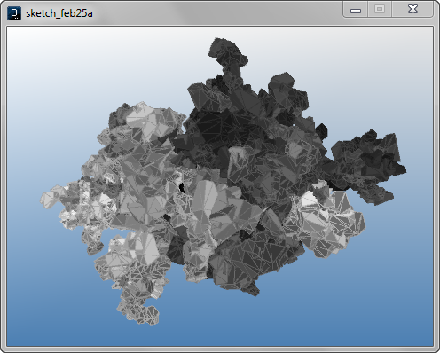 import igeo.*; import processing.opengl.*; void setup() { size(480, 360, IG.GL); IRand.init(2); IG.duration(40); IG.open("mesh1.3dm"); IMesh mesh = IG.mesh(0); mesh.del(); //hide the original new MyAgent(mesh, IG.v(0, 0, 0), IG.v(1, 0, 0), IG.v(0, 0, 1)).clr(0.5); } class MyAgent extends IAgent { IVec pt1, pt2, axis; boolean isColliding=false; IMesh mesh; MyAgent(IMesh m, IVec pos, IVec dir, IVec ax) { pt1 = pos; pt2 = pos.cp(dir); axis = ax; mesh = m; } void interact(ArrayList < IDynamics > agents) { for (int i=0; i < agents.size() && !isColliding; i++) { if (agents.get(i) instanceof MyAgent) { MyAgent agent = (MyAgent)agents.get(i); if (agent != this) { double dist = agent.pt2.dist(pt2); //distance of end points double tolerance = 0.5; //smaller number allows more collision if (dist < pt1.dist(pt2)*tolerance) { isColliding = true; } } } } } void update() { if (isColliding) { del(); } else if (time()==0) { double meshScale = IRand.get(2.0, 5.0); IVec meshDir1 = pt2.dif(pt1).mul(meshScale); IVec meshDir2 = meshDir1.cp().rot(axis, PI/2); IVec meshDir3 = meshDir1.cross(meshDir2).len(meshDir1.len()); // perpendicular to meshDir1 and meshDir2 mesh.cp().transform(meshDir1, meshDir2, meshDir3, pt1).clr(clr()); axis = meshDir3; if (IRand.pct(95)) { //branch 1 IVec dir = pt2.dif(pt1); double angle = IRand.get(-PI/3, PI/3); dir.rot(axis, angle); double scale = IRand.get(0.90, 1.05); dir.mul(scale); IVec axis2 = axis.cp().rot(dir, IRand.get(-PI/3, PI/3)); double gray = (red()+green()+blue())/3+ IRand.get(-0.05,0.05); new MyAgent(mesh, pt2.cp(), dir, axis2).clr(gray); } if (IRand.pct(50)) { //branch 2 IVec dir = pt2.dif(pt1); double angle = IRand.get(-PI/3*2, PI/3*2); dir.rot(axis, angle); double scale = IRand.get(0.90, 1.05); dir.mul(scale); IVec axis2 = axis.cp().rot(dir, IRand.get(-PI/3, PI/3)); double gray = (red()+green()+blue())/3 + IRand.get(-0.05,0.05); new MyAgent(mesh, pt2, dir, axis2).clr(gray); } } } }