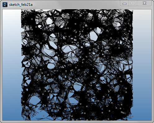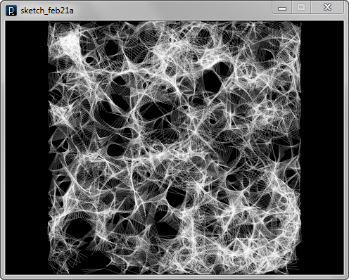 add_library('igeo') def setup() : size(480, 360, IG.GL) IG.duration(800) for i in range(200) : MyBoid(IRand.pt(1,1,0),IRand.pt(-0.01,-0.01,0,0.01,0.01,0)) IG.bg(0) #black background IG.top() #only showing the top view IG.focus() #focusing into existing geometries class MyBoid(IBoid) : def __init__(self, pos, vel) : IBoid.__init__(self,pos,vel) self.cohesionDist(0.03) self.cohesionRatio(1) self.separationDist(0.04) self.separationRatio(2) self.alignmentDist(0.03) self.alignmentRatio(0) def interact(self, agents) : for agent in agents : if agent is self : return if isinstance(agent, MyBoid) : dist = self.pos().dist(agent.pos()) if dist < 0.08 : if IG.time()%15==0 : ICurve(self.pos().cp(),agent.pos().cp()).clr(1.0,0.2) #transparent white def update(self) : if self.pos().x() < 0.0 : self.pos().add(1, 0, 0) elif self.pos().x() > 1.0 : self.pos().sub(1, 0, 0) if self.pos().y() < 0.0 : self.pos().add(0, 1, 0) elif self.pos().y() > 1.0 : self.pos().sub(0, 1, 0)