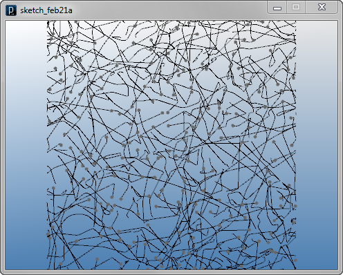 add_library('igeo') def setup() : size(480, 360, IG.GL) IG.duration(800) for i in range(200) : MyBoid(IRand.pt(1,1,0),IRand.pt(-0.01,-0.01,0,0.01,0.01,0)) IG.top() #only showing the top view IG.focus() #focusing into existing geometries class MyBoid(IBoid) : def __init__(self, pos, vel) : IBoid.__init__(self,pos,vel) self.cohesionDist(0.03) self.cohesionRatio(1) self.separationDist(0.04) self.separationRatio(2) self.alignmentDist(0.03) self.alignmentRatio(0) def interact(self, agents) : for agent in agents : if agent is self : return if isinstance(agent, MyBoid) : dist = self.pos().dist(agent.pos()) if dist < 0.08 : if IG.time()%15==0 : ICurve(self.pos().cp(),agent.pos().cp()).clr(0) def update(self) : if self.pos().x() < 0.0 : self.pos().add(1, 0, 0) elif self.pos().x() > 1.0 : self.pos().sub(1, 0, 0) if self.pos().y() < 0.0 : self.pos().add(0, 1, 0) elif self.pos().y() > 1.0 : self.pos().sub(0, 1, 0)