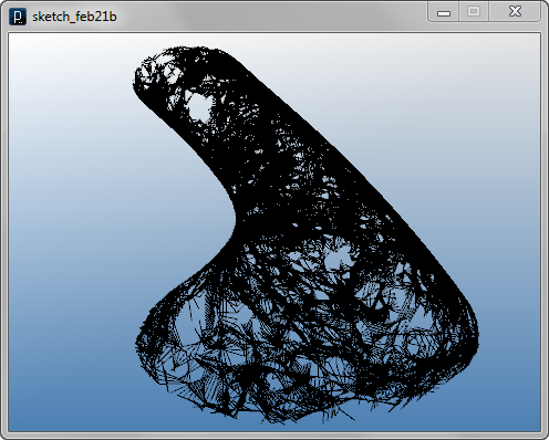 add_library('igeo') def setup() : size(480, 360, IG.GL) IG.duration(800) IG.open("surface13.3dm") surf = IG.surface(0) for i in range(300) : MyBoidOnSurface(surf,IRand.pt(1,1,0),IRand.pt(-0.01,-0.01,0,0.01,0.01,0)) surf.del() class MyBoidOnSurface(IBoid) : def __init__(self, srf, pos, vel) : IBoid.__init__(self,pos,vel) self.surface = srf self.surfPt = srf.pt(pos) self.hide() #hiding a point of boid self.cohesionDist(0.03) self.cohesionRatio(1) self.separationDist(0.04) self.separationRatio(2) self.alignmentDist(0.03) self.alignmentRatio(0) def interact(self, agents) : for agent in agents : if agent is self : return if isinstance(agent, MyBoidOnSurface) : dist = self.surfPt.dist(agent.surfPt) if dist < 5.0 : if IG.time()%15==0 : ICurve(self.surfPt.cp(),agent.surfPt.cp()).clr(0) def update(self) : if self.pos().x() < 0.0 : self.pos().add(1, 0, 0) elif self.pos().x() > 1.0 : self.pos().sub(1, 0, 0) if self.pos().y() < 0.0 : self.pos().add(0, 1, 0) elif self.pos().y() > 1.0 : self.pos().sub(0, 1, 0) self.surfPt = self.surface.pt(self.pos()) #update surface point
