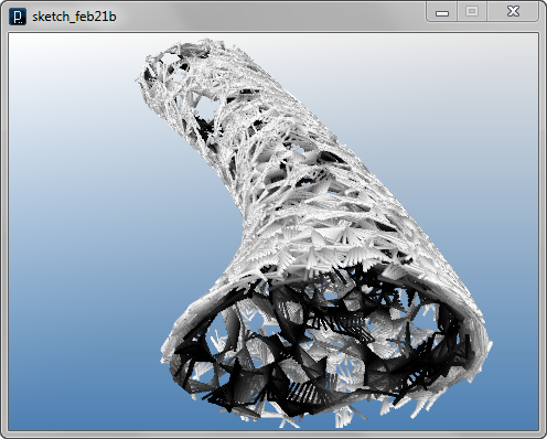 add_library('igeo') def setup() : size(480, 360, IG.GL) IG.duration(800) IG.open("surface13.3dm") surf = IG.surface(0) for i in range(300) : MyBoidOnSurface(surf,IRand.pt(1,1,0),IRand.pt(-0.01,-0.01,0,0.01,0.01,0)) surf.del() class MyBoidOnSurface(IBoid) : def __init__(self, srf, pos, vel) : IBoid.__init__(self,pos,vel) self.surface = srf self.surfPt = srf.pt(pos) self.hide() #hiding a point of boid self.cohesionDist(0.03) self.cohesionRatio(1) self.separationDist(0.04) self.separationRatio(2) self.alignmentDist(0.03) self.alignmentRatio(0) def interact(self, agents) : for agent in agents : if agent is self : return if isinstance(agent, MyBoidOnSurface) : dist = self.surfPt.dist(agent.surfPt) if dist < 5.0 and dist > 2.0 : if IG.time()%15==0 : #controlling depth depth = sin(IG.time()*0.01)*1.5 pt1 = self.surface.pt(self.pos().x(), self.pos().y(), depth) pt2 = agent.surface.pt(agent.pos().x(), agent.pos().y(), depth) gray = sin(IG.time()*0.01)*0.5+0.5 IG.meshSquareStick(pt1,pt2,0.4).clr(gray) def update(self) : if self.pos().x() < 0.0 : self.pos().add(1, 0, 0) elif self.pos().x() > 1.0 : self.pos().sub(1, 0, 0) if self.pos().y() < 0.0 : self.pos().add(0, 1, 0) elif self.pos().y() > 1.0 : self.pos().sub(0, 1, 0) self.surfPt = self.surface.pt(self.pos()) #update surface point