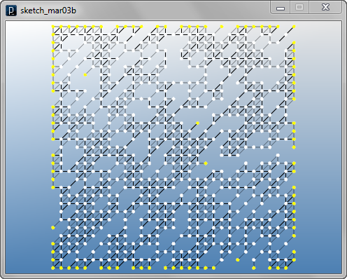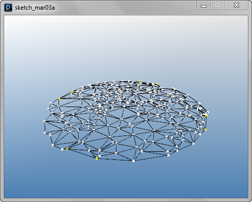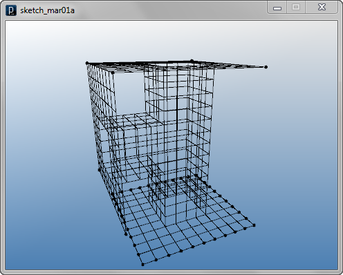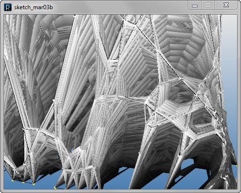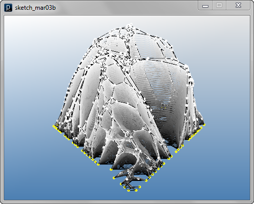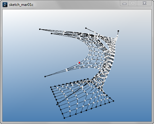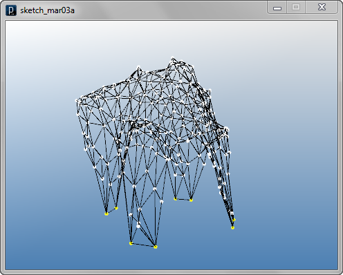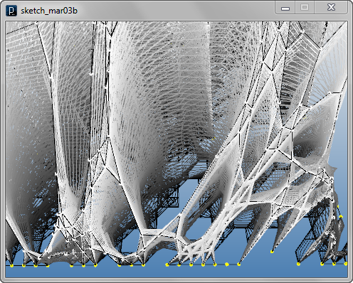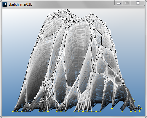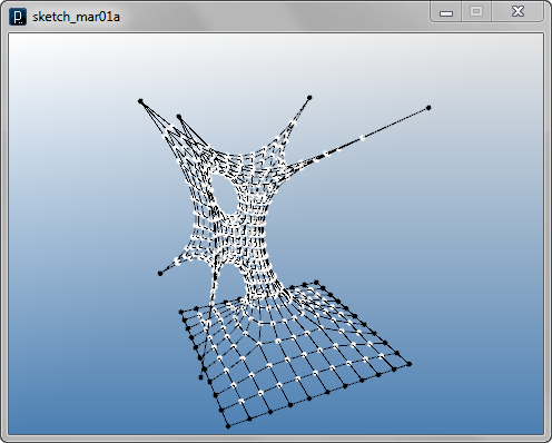 import igeo.*; import processing.opengl.*; size(480, 360, IG.GL); IG.open("lines1.3dm"); ITensileNet.create(IG.curves(), IG.points());