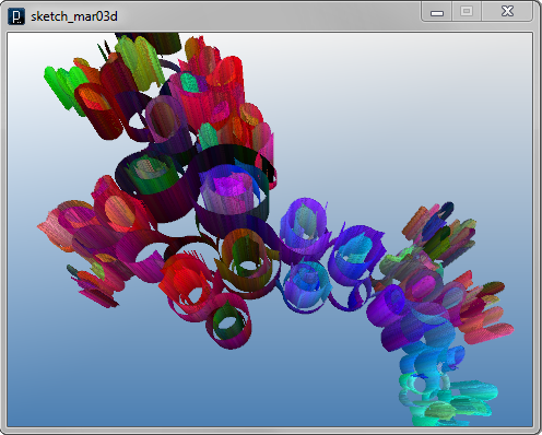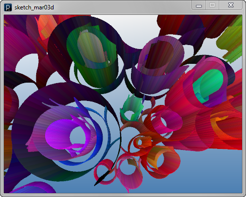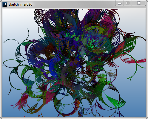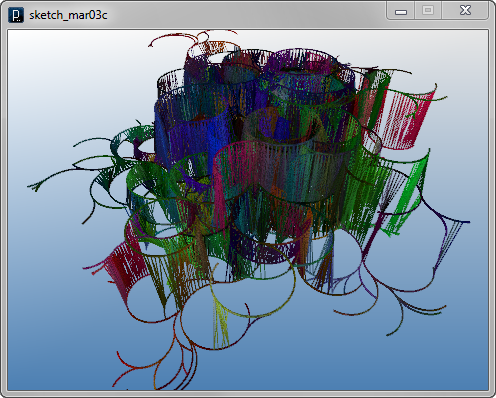 import processing.opengl.*; import igeo.*; void setup() { size(480, 360, IG.GL); IG.duration(80); double z = 0; for(int i=0; i < 20; i++){ //IRand.dir() is giving a random direction with given length perpendicular to given axis new LineAgent(IRand.pt(-30,-30,z,30,30,z), IRand.dir(IG.zaxis,2), 100.0, 4.5).clr(0); z += IRand.get(1,5); } } static class LineAgent extends IAgent{ IVec pos; IVec dir; double pctL, pctR; boolean isColliding=false; IVec intersection; LineAgent(IVec pt, IVec dir, double pctL, double pctR) { pos = pt; this.dir = dir; this.pctL = pctL; this.pctR = pctR; } public void interact(ArrayList < IDynamics > agents){ if(time()==0){ for(int i=0; i < agents.size() && !isColliding ; i++){ if(agents.get(i) instanceof LineAgent){ LineAgent a = (LineAgent)agents.get(i); if(a != this){ //draw interconnection in z if( !pos.eqZ(a.pos) ){ //z is not equal double minLen = dir.len(); if(a.dir.len() < minLen){ minLen = a.dir.len(); } double threshold = minLen * 2.5; if( pos.eqX(a.pos, threshold) && pos.eqY(a.pos, threshold) ){ //x and y is equal with in given tolerance if(IRand.pct(60)){ //new ICurve(pos, a.pos).clr(clr()); IG.meshSquareStick(pos, a.pos, 0.3).clr(clr()); } } } else{ IVec pos2 = pos.cp(dir); IVec apos2 = a.pos.cp(a.dir); if(!apos2.eq(pos) && !a.pos.eq(pos)){ //not sharing root intersection = IVec.intersectLine(a.pos,apos2,pos,pos2); //keep intersection to draw line later if(intersection!=null){ //intersecting isColliding=true; } } } } } } } } public void update() { if(time()==0){ if(isColliding){ //new ICurve(pos, intersection).clr(clr()); IG.meshSquareStick(pos, intersection, 0.5).clr(clr()); //keep line to intersection del(); return; } IVec pos2 = pos.dup().add(dir); //new ICurve(pos, pos2).clr(clr()); IG.meshSquareStick(pos, pos2, 0.5).clr(clr()); double r = red() + IRand.get(-0.05, 0.05); double g = green() + IRand.get(-0.05, 0.05); double b = blue() + IRand.get(-0.05, 0.05); boolean branchL = IRand.pct(pctL); boolean branchR = IRand.pct(pctR); double lenL = dir.len(); double lenR = dir.len(); lenL*=0.995; //shrinking length lenR*=0.995; //shrinking length if (branchL && branchR) { //only when branching both if(IRand.pct(50.0)){ if (pctL < pctR) { lenL *= 0.9; } else{ lenR *= 0.9; } } else if(IRand.pct(6.0)){ if (pctL < pctR) { lenL *= 0.4; } else{ lenR *= 0.4; } } else if(IRand.pct(5.0)){ if (pctL < pctR) { lenL *= 1.4; } else{ lenR *= 1.4; } } } if (branchL) { //bend left IVec dir2 = dir.dup(); dir2.len(lenL); //update length dir2.rot(PI/30); if(branchR && pctR > pctL){ //swap L/R% when branching both new LineAgent(pos2, dir2, pctR, pctL).clr(r,g,b); } else{ new LineAgent(pos2, dir2, pctL, pctR).clr(r,g,b); } } if (branchR) { //bend right IVec dir2 = dir.dup(); dir2.len(lenR); //update length dir2.rot(-PI/30); if(branchL && pctR < pctL){ //swap L/R% when branching both new LineAgent(pos2, dir2, pctR, pctL).clr(r,g,b); } else{ new LineAgent(pos2, dir2, pctL, pctR).clr(r,g,b); } } } } }