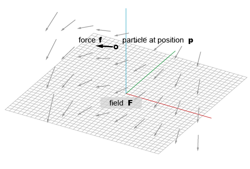 An attractor and a repulsion force defines a 3D vector force towards the position of attractor/repulsion from the position of a particle.