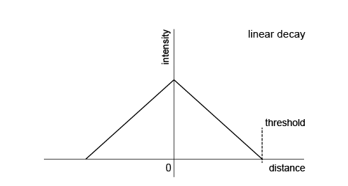 The second decay type is linear decay. This type is specified with a parameter of threshold. When the distance from the geometry is equal to the threshold, the intensity becomes zero. You can specify this type by linearDecay(threshold). There is also an alias of this method linear(threshold).
