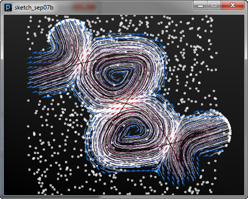add_library('igeo') size(480, 360, IG.GL) IG.darkBG() field = ICompoundField() for i in range(30) : if IRand.pct(40) : field.add(IAttractor(IRand.pt(-20,-20,20,20)).intensity(-10).gaussian(20)) elif IRand.pct(50) : field.add(IPointCurlField(IRand.pt(-20,-20,20,20),IVec(0,0,1))) else : field.add(IGravity(IRand.pt(-20,-20,20,20),IRand.pt(-1,-1,1,1))) IFieldVisualizer(-20,-20,0, 20,20,0, 40,40,1) for i in range(2000) : IParticleTrajectory(IRand.pt(-20,-20,20,20)).fric(0.1).clr(1.0,0.7)