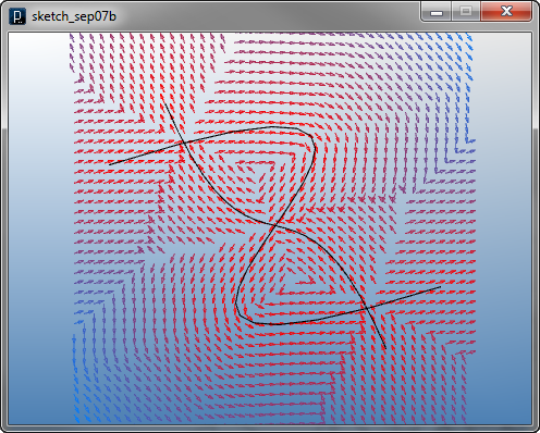 First, a curve attractor field attracts a particle to the closest point on the curve. The class in the library is ICurveAttractorField. You put one curve as an input to build the curve attractor. The curve attractor field is visualized below.