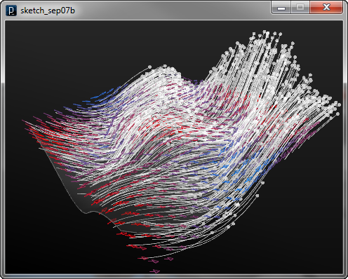 add_library('igeo') size(480, 360, IG.GL) IG.darkBG() IG.open("surface_field1.3dm") for i in range(IG.surfaceNum()) : ISurfaceUTangentField(IG.surface(i)).linear(50).intensity(10) IFieldVisualizer(-20,-20,-2, 20,20,0, 20,20,2) for i in range(1000) : IParticleTrajectory(IRand.pt(-20,-20,-5,20,20,0)).fric(0.1).clr(1.0,0.7)