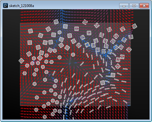 add_library('igeo') size(480, 360, IG.GL) IAttractor(-50,0,0).intensity(10).clr(1.0,0,0) #attractor IAttractor(50,0,0).intensity(-10).clr(0,0,1.0) #repulsion # last 3 inputs are sample number in x, y, z. IFieldVisualizer(-100, -50, 0, 100, 50, 0, 40, 20, 1)