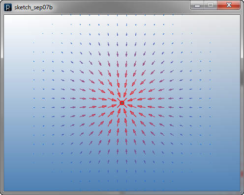 add_library('igeo') size(480, 360, IG.GL) IAttractor(0,0,0).gaussianDecay(100) IFieldVisualizer(-100,-100,0,100,100,0,20,20,1).fixLength(False)