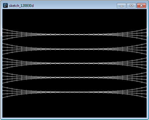 add_library('igeo') size(480, 360, IG.GL) IG.bg(0) IG.open("tension_lines1.3dm") curves = IG.curves() division=30 inc = 1.0/division for crv in curves : pts = [] for j in range(division+1) : # creating particles pts.append(IParticle( crv.pt( j*inc ) ).fric(0.01)) pts[0].fix() # fixing the start point pts[division].fix() # fixing the end point for j in range(division) : # connecting particles ITensionLine(pts[j], pts[j+1]).tension(150).clr(1.0, 0.5).weight(2) crv.del()