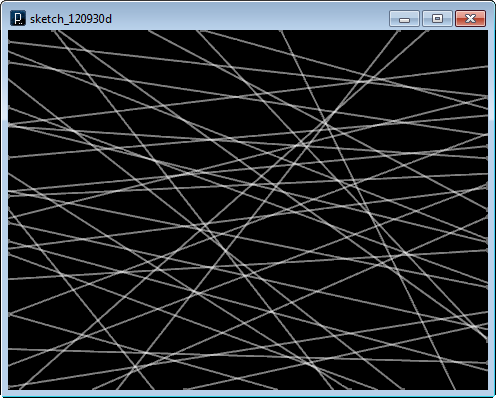 The next example only changes the input file. When you have random intersecting lines, swarm forces to cluster together are clear. The final lines are result of the balance between gathering swarm forces and smoothing tension forces. The code below also hides points by hide() method.