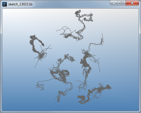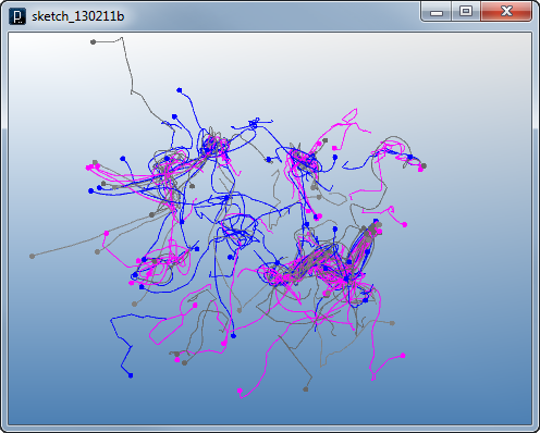 add_library('igeo') def setup() : size(480,360,IG.GL) for i in range(100) : MyParticle(IRand.pt(-50,-50,0,50,50,0), IVec(0,0,0)) class MyParticle(IParticleTrajectory) : def __init__(self, p, v) : IParticleTrajectory.__init__(self,p,v) # initialize with position and velocity self.fric(0.05) # 5% friction self.state = 0 # initial state def interact(self, agents) : for agent in agents : if isinstance(agent, MyParticle) : if agent is not self : if agent.pos().dist(self.pos()) < 15 : # closer than 15 dif = self.pos().dif(agent.pos())#other to this dif.len(40) # intensity of force if self.state == 1 : # attraction agent.push(dif) elif self.state == 2 : # repulsion agent.pull(dif) def update(self) : if IRand.pct(10) : self.push(IRand.pt(-500,-500,0,500,500,0)) if IRand.pct(1) : # switch state if self.state == 0 : # state 0 -> 1 self.state = 1 # attraction self.clr(1.0,0,1.0) elif self.state == 1 : # state 1 -> 2 self.state = 2 # repulsion self.clr(0,0,1.0) else : # state 2 -> 0 self.state = 0 # random walk only self.clr(0.5)