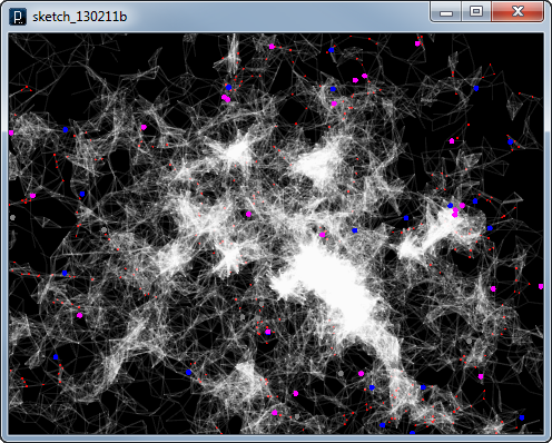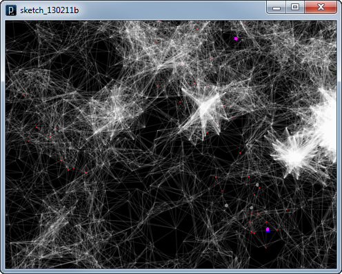 add_library('igeo') def setup() : size(480,360,IG.GL) for i in range(100) : MyParticle(IRand.pt(-50,-50,0,50,50,0), IVec(0,0,0)) IG.bg(0) class MyParticle(IParticle) : def __init__(self, p, v) : IParticle.__init__(self,p,v) # initialize with position and velocity self.fric(0.05) # 5% friction self.state = 0 # initial state def interact(self, agents) : for agent in agents : if isinstance(agent, MyParticle) : if agent is not self : if agent.pos().dist(self.pos()) < 15 : # closer than 15 dif = self.pos().dif(agent.pos())#other to this dif.len(20) # intensity of force if self.state == 1 : # attraction agent.push(dif) elif self.state == 2 : # repulsion agent.pull(dif) def update(self) : if IRand.pct(10) : self.push(IRand.pt(-500,-500,0,500,500,0)) if IRand.pct(1) : # switch state if self.state == 0 : # state 0 -> 1 self.state = 1 # attraction self.clr(1.0,0,1.0) elif self.state == 1 : # state 1 -> 2 self.state = 2 # repulsion self.clr(0,0,1.0) else : # state 2 -> 0 self.state = 0 # random walk only self.clr(0.5) if self.time()%20 == 0 : Anchor(self.pos().cp()) class Anchor(IAgent) : def __init__(self, p) : self.pos = p self.point = IPoint(self.pos).clr(1.0,0,0).size(2) def interact(self, agents) : if self.time() == 0 : # only when the first time for agent in agents : if isinstance(agent, Anchor) : if agent is not self and agent.time() > 0 : # exclude anchors just created if agent.pos.dist(self.pos) < 10 : # closer than 10 ICurve(agent.pos, self.pos).clr(1.0,0.1) def update(self) : if self.time()==100 : # delete after 100 time frame self.point.del() self.del()