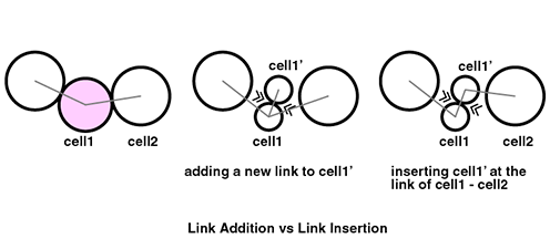 When a child cell is inserted at an existing link, the code actually deletes the existing link and create a new links from the parent to the child and another link from the child to the cell at the opposite end of the existing link. To delete a link, CellLink class adds a method delete and this method unregisters the link from the list of links inside each cell. For a cell to find the cell at the opposite end of link, CellLink class also adds a method oppositeCell.