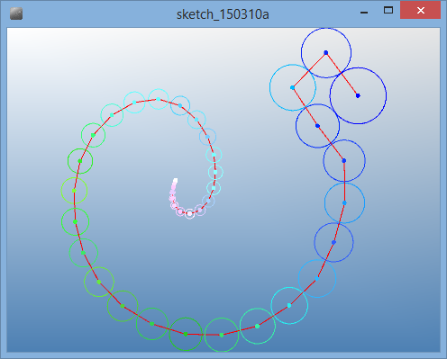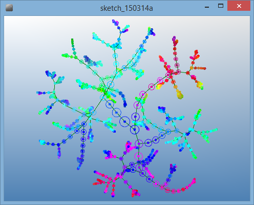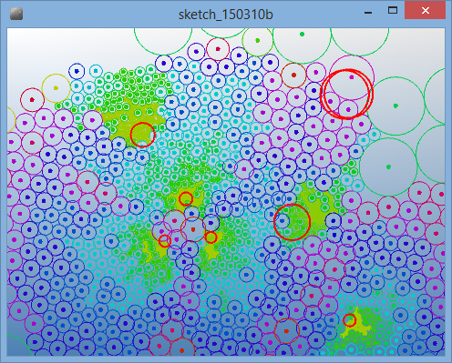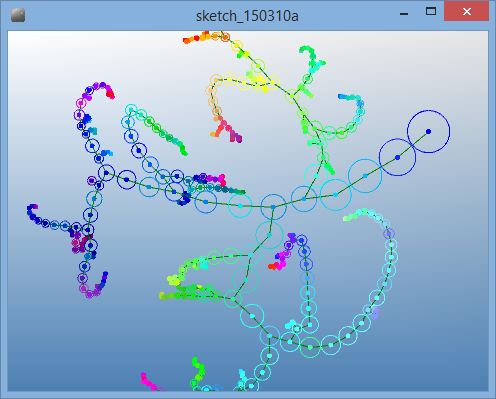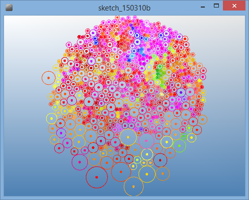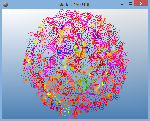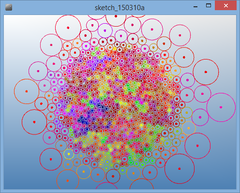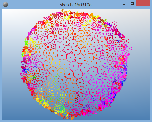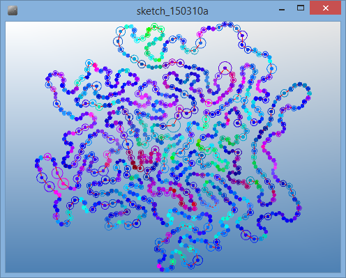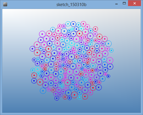 import igeo.*; import processing.opengl.*; void setup(){ size(480,360,IG.GL); new Cell(new IVec(0,0,0), 10).clr(1.0,0,0); } class Cell extends IParticle{ int growthDuration = 2000; //duration of growth and division int growthInterval = 10; int divisionInterval = 100; double maxRadius = 100; double growthSpeed = 0.1; double radius; ICircle circle; Cell(IVec pos, double rad){ super(pos, new IVec(0,0,0)); radius = rad; fric(0.1); } void interact(ArrayList < IDynamics > agents){ for(int i=0; i < agents.size(); i++){ if(agents.get(i) instanceof Cell){ Cell c = (Cell)agents.get(i); if(c != this){ // push if closer than two radii if(c.pos().dist(pos()) < c.radius+radius){ IVec dif = c.pos().dif(pos()); dif.len( ((c.radius+radius)-dif.len())*100+50); // the closer the harder to push c.push(dif); } } } } } void update(){ if(IG.time() < growthDuration){ if(time() > 0 && time()%divisionInterval==0){ if(IRand.pct(50)){ divide(); } } if(time()%growthInterval==0){ grow(); } } // update geometry if(circle==null){ circle = new ICircle(pos(), radius).clr(clr()); } else{ circle.center(pos()).radius(radius); } } void divide(){ // cell division IVec dir = IRand.dir(IG.zaxis); radius *= 0.5; //make both cell size half dir.len(radius); Cell child = new Cell(pos().cp().add(dir), radius); child.hsb(hue()+IRand.get(-.1,.1),saturation()+IRand.get(-.1,.1),brightness()+IRand.get(-.1,.1)); pos().sub(dir); } void grow(){ // growing cell size if(radius < maxRadius){ radius += growthSpeed; } } }