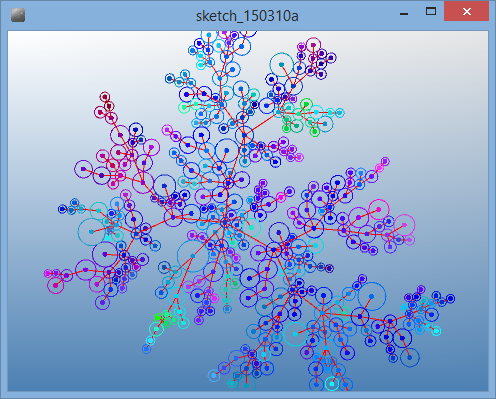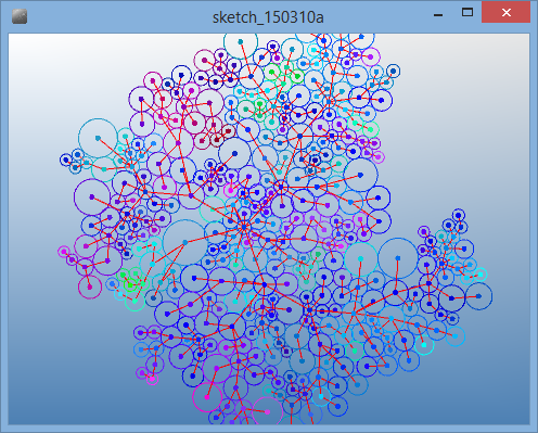 Just to show the effect of tensile links and the network structure of links clearer, the code below adds another repulsion behavior in interact method to push other cells when they are within a certain distance range (30) in addition to the original repulsion force not to have their body defined by radius overlapped.
