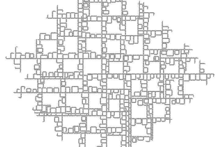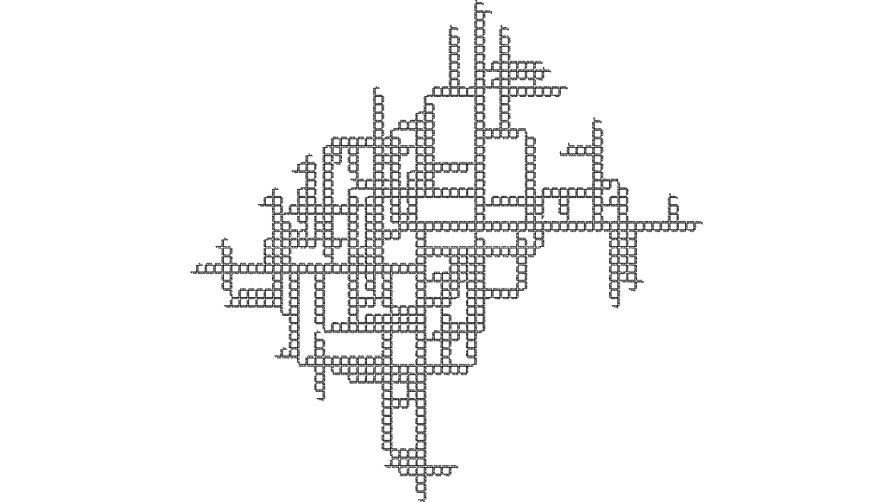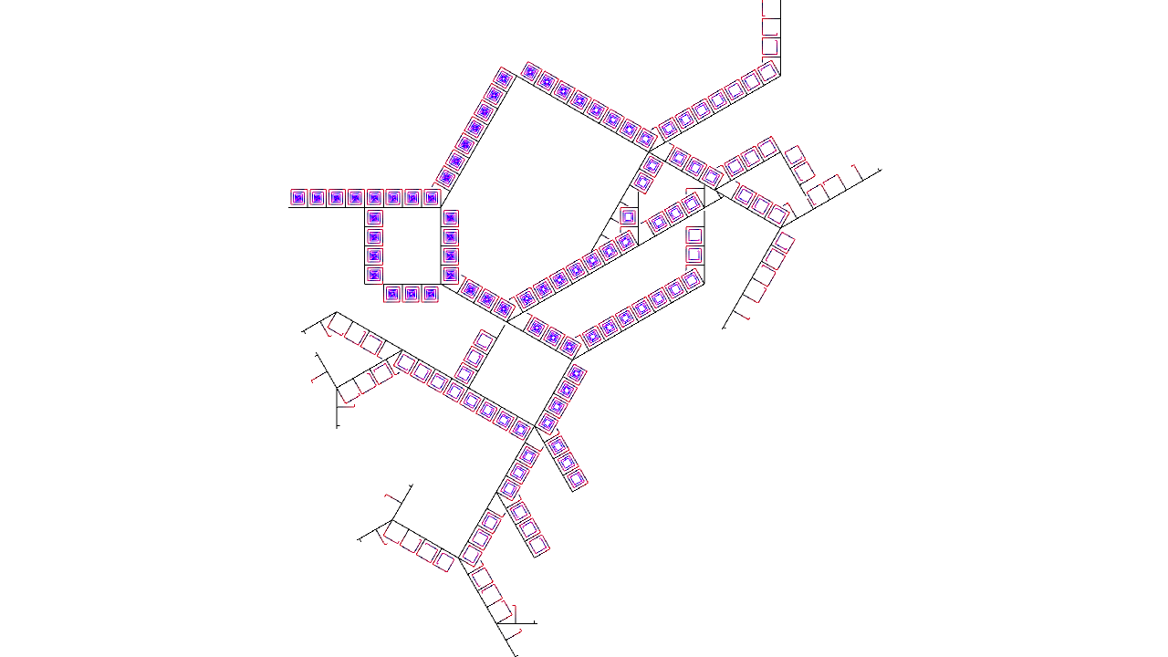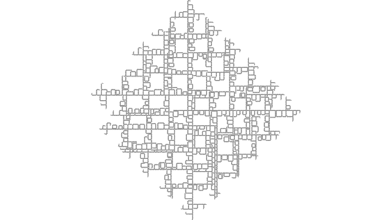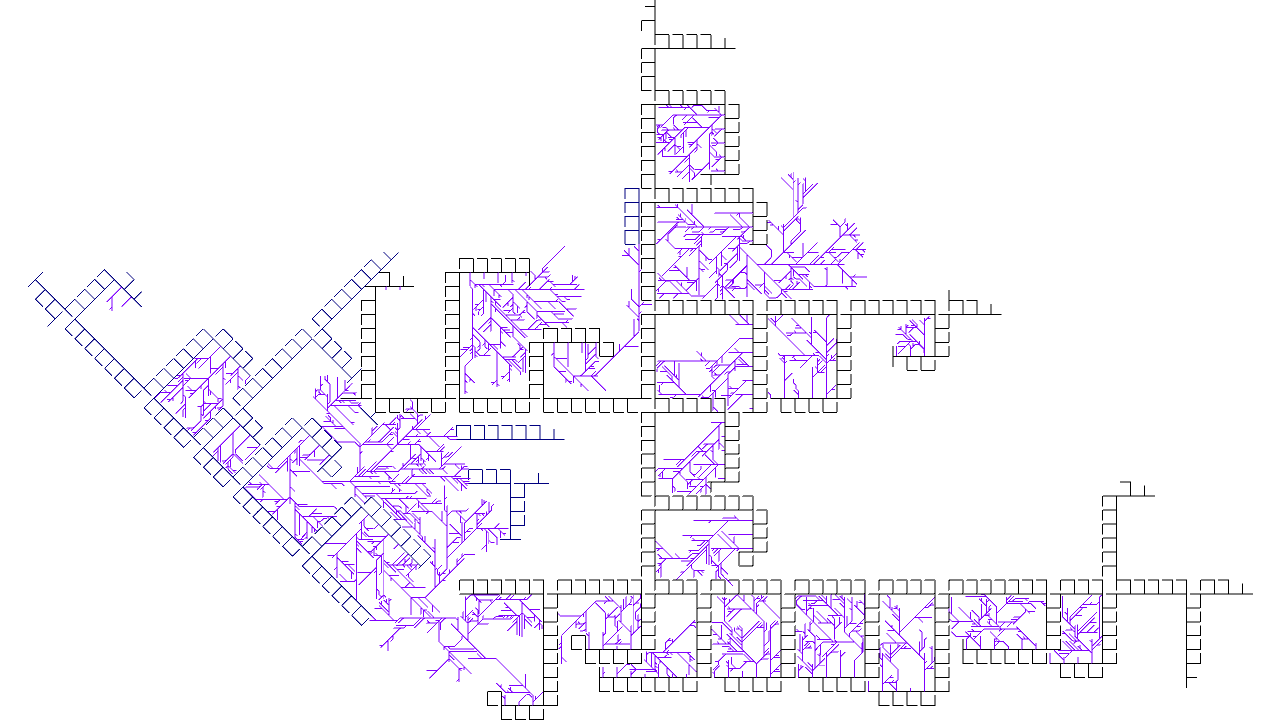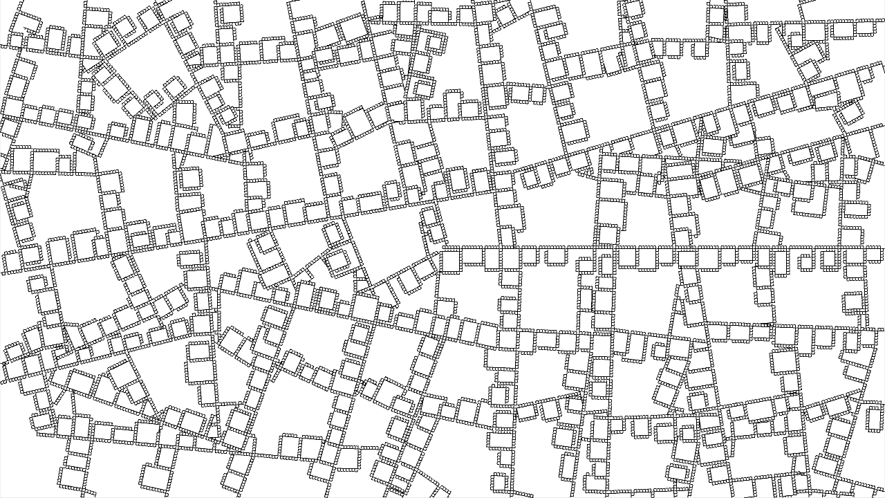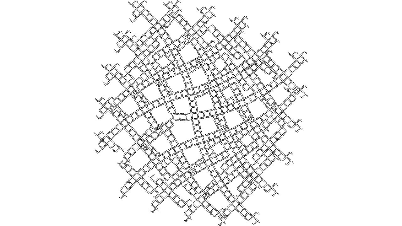 void rules(){ if(clock(6)==0){ if(clock(0)==3){ if(clock(1)==0){ if(clock(2) >= IRand.getInt(2,10)){ next(rot(-PI/2), 3); } else{ next(2); } } if(clock(4) == 2){ if(clock(1)==2 && clock(2)==0 && clock(3)==0){ // left if(IRand.pct(70)) next(rot(-PI/2), 5); } if(clock(1)==2 && clock(2)==0 && clock(3)==1){ // straight next(rot(-PI/2), 5); } if(clock(1)==2 && clock(2)==0 && clock(3)==2){ // right if(IRand.pct(70)) next(rot(-PI/2), 5); } } else if(clock(1)==2 && clock(2)==0 && clock(3)==1){ next(rot(-PI/2), 4); } next(rot(PI/2), 1); } else{ if(clock(0)==2 && clock(1)==0 && clock(3)==2){ next(rot(-PI/2).mul(1), 6).clr(0.5,0,1); } next(0); } } else{ // branch mode if(clock(1)==60){ if(IRand.pct(10)){ next(mul(1), 7).clr(0,0,0.5); } } else{ if(IRand.pct(20)){ next(rot(-PI/4), 1); } if(IRand.pct(20)){ next(rot(PI/4), 1); } if(IRand.pct(90)){ next(1); } } } }