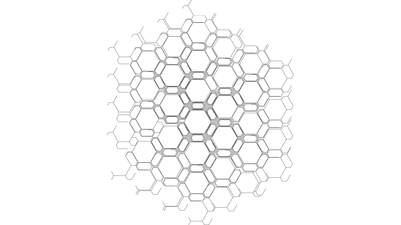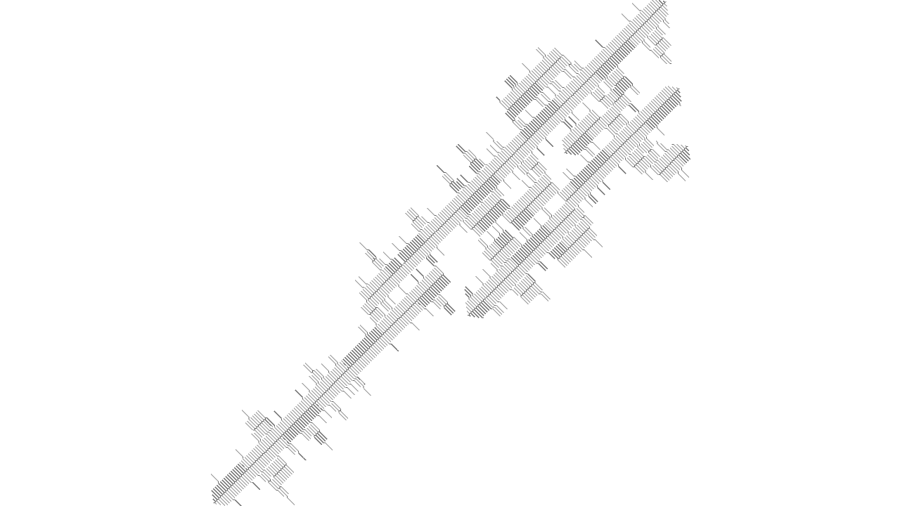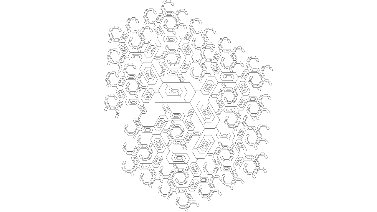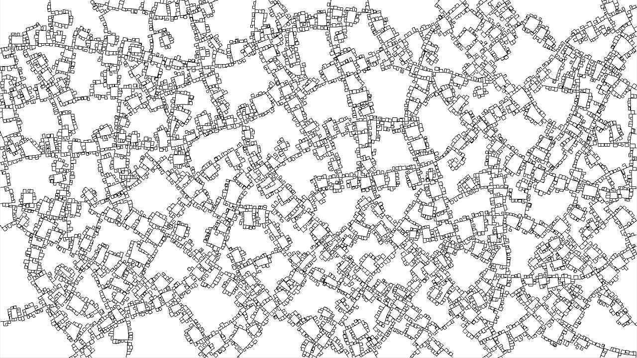void setup(){ size(640, 480, IG.GL); IConfig.syncDrawAndDynamics=true; IG.bg(1.0); new ClockStackAgent(new IVec(0,0,0), new IVec(0,0,10), new IVec(0,-1,0), null, null).clr(0.2); } //... void rules(){ double rinc = 0.002; double ginc = 0.02; double ginc2 = 0.05; double binc = 0.004; if(clock(2)==1){ next(pitch(-PI/70), 0).clr(red(),green(),blue()+binc); } else if(clock(3)==1){ next(pitch(-PI/96).rot(-PI/96).roll(PI/6000), 0).clr(red(),green(),blue()+binc); } else if(clock(4)==1){ next(pitch(-PI*0.01475), 0).clr(red(),green(),blue()+binc); } else if(clock(5)==1){ next(rot(-PI*0.01545), 0).clr(red(),green(),blue()+binc); } else if(clock(6)==1){ if(clock(0)==5){ next(pitch(-PI/4-PI/10), 1).clr(red(),green()+ginc,blue()); if(clock(1)%5==0){ if(IRand.pct(1)){ next(pitch(PI/2).mul(0.5), 1).clr(red(),green()+ginc,blue()); } else if(IRand.pct(1)){ next(rot(PI/2).mul(0.5), 12).clr(red(),green()+ginc,blue()); } else if(IRand.pct(1)){ next(rot(-PI/2).mul(0.5), 12).clr(red(),green()+ginc,blue()); } else if(IRand.pct(0.5)){ next(mul(0.5), 11).clr(red(),green()+ginc,blue()); } } } else next(pitch(PI/20), 0).clr(red(),green(),blue()+binc); } else if(clock(7)==1){ next(pitch(-PI/58), 0).clr(red(),green(),blue()+binc); } else if(clock(8)==1){ if(clock(0)==5) next(rot(PI/4).pitch(-PI/58), 1).clr(red(),green()+ginc,blue()); else next(rot(-PI/20).pitch(-PI/58), 0).clr(red(),green(),blue()+binc); } else if(clock(9)==1){ if(clock(1)==0){ if(clock(0)==15) next(1).clr(red(),green(),blue()+binc*2); else next(0).delay(0).clr(red(),green(),blue()+binc*2); } else{ next(pitch(-PI/35).mul(0.99), 0).clr(red(),green(),blue()+binc*2); } } else if(clock(10)==1){ if(clock(1)==0){ next(pitch(-PI/2), 1).clr(red(),green()+ginc,blue()); } } else if(clock(11)==1){ if(clock(0)<35) next(0).clr(red(),green()+ginc,blue()); next(rot(PI/2).mul(1+0.08*cos(2*PI*clock(0)/35)), 9).clr(red(),green()+ginc2,blue()); next(rot(-PI/2).mul(1+0.08*cos(2*PI*clock(0)/35)), 9).delay(25).clr(red(),green()+ginc2,blue()); } else{ if(clock(1)==0){ if(clock(0)==2){ next(pitch(-PI/4), 1).clr(red(),green()+ginc,blue()); } else next(0).clr(red()+rinc,green(),blue()); next(rot(PI/2).pitch(-PI/120), 2).clr(red(),green()+ginc2,blue()); } else if(clock(1)==1){ if(clock(0)==8) next(pitch(PI/4), 1).clr(red(),green()+ginc,blue()); else next(mul(0.97),0).clr(red()+rinc,green(),blue()); next(rot(PI/2-PI/192).pitch(-PI/192), 3).clr(red(),green()+ginc2,blue()); } else if(clock(1)==2){ if(clock(0)==2){ next(pitch(-PI/2), 0).clr(red()+rinc,green(),blue()); next(rot(PI/2).pitch(-PI*0.01475/2), 4).clr(red(),green()+ginc2,blue()); } else if(clock(0)==3){ next(pitch(PI/2).mul(1.114), 1).clr(red(),green()+ginc,blue()); next(mul(0.954), 0).clr(red()+rinc,green(),blue()); next(rot(PI/2-PI*0.01545/2), 5).clr(red(),green()+ginc2,blue()); } else if(clock(0)==4){ next(rot(PI/2-PI*0.01545/2), 5).clr(red(),green()+ginc2,blue()); } else{ next(0).clr(red()+rinc,green(),blue()); next(rot(PI/2).pitch(-PI*0.01475/2), 4).clr(red(),green()+ginc2,blue()); } } else if(clock(1)==3){ if(clock(0)>=260) next(1).clr(red(),green()+ginc,blue()); else{ next(mul(0.997), 0).clr(red()+rinc,green(),blue()); if(IRand.pct(1)){ if(IRand.pct(50)){ next(pitch(PI/4).mul(0.7), 0).clr(red()+rinc,green(),blue()); } else{ next(pitch(-PI/4).mul(0.7), 0).clr(red()+rinc,green(),blue()); } } } if(IRand.pct(80)){ next(rot(PI/2).pitch(-PI/6-PI/120), 6).clr(red(),green()+ginc2,blue()); } else{ next(rot(PI/2).pitch(-PI/6-PI/120).mul(0.5), 6).clr(red(),green()+ginc2,blue()); } } else if(clock(1)==4){ if(clock(0)==7) next(1).clr(red(),green()+ginc,blue()); else next(0).clr(red()+rinc,green(),blue()); next(rot(PI/2).pitch(-PI/120), 7).clr(red(),green()+ginc2,blue()); } else if(clock(1)==5){ next(1).clr(red(),green()+ginc,blue()); } else if(clock(1)==6){ if(clock(0)==6) next(1).clr(red(),green()+ginc,blue()); else next(0).clr(red()+rinc,green(),blue()); next(rot(PI/2).pitch(-PI/120).rot(PI/8), 8).clr(red(),green()+ginc2,blue()); } else if(clock(1)==7){ if(clock(0)==4){ next(pitch(-PI/2), 11).clr(red(),green()+ginc,blue()); } else next(0).clr(red()+rinc,green(),blue()); } } }