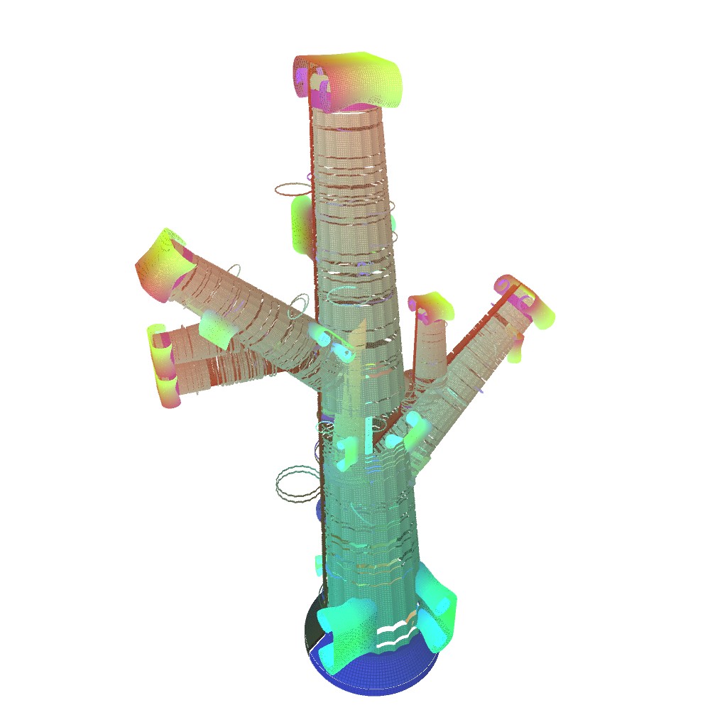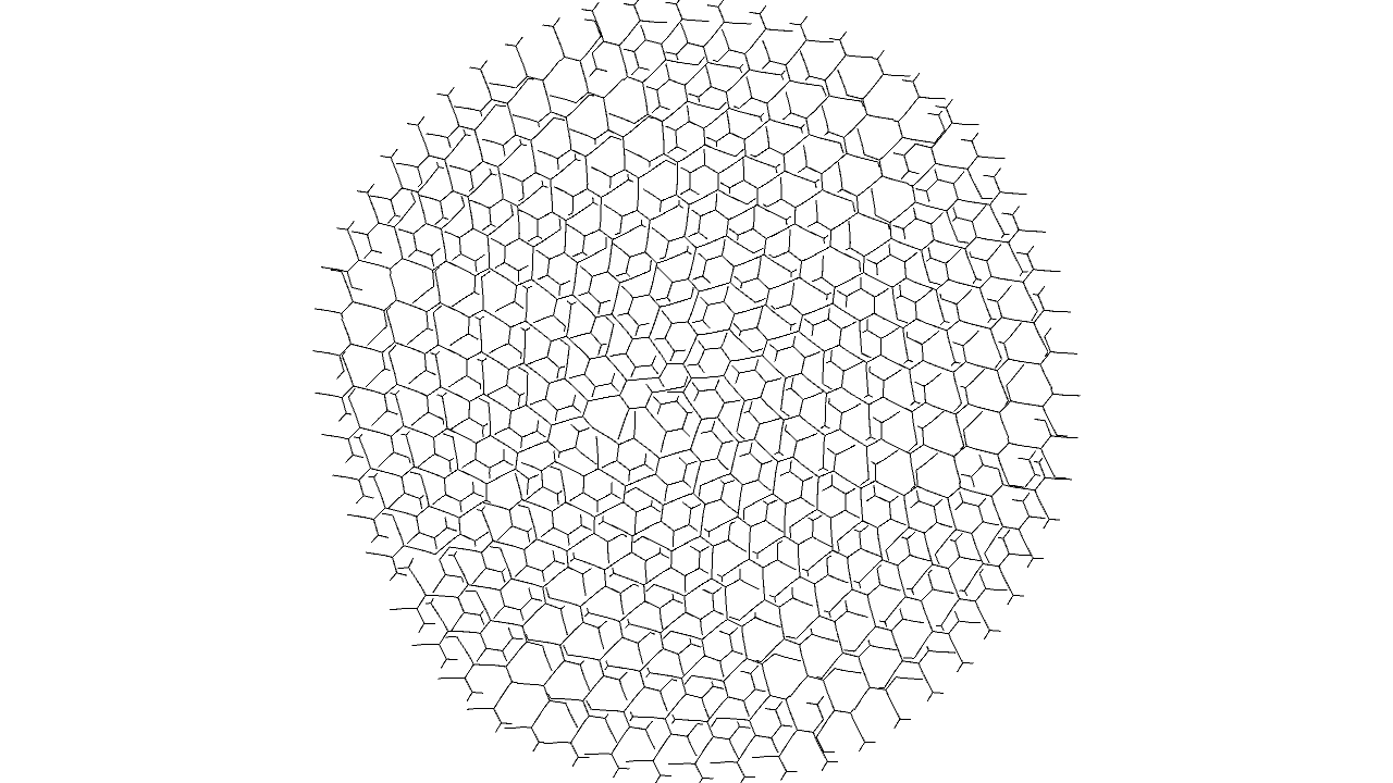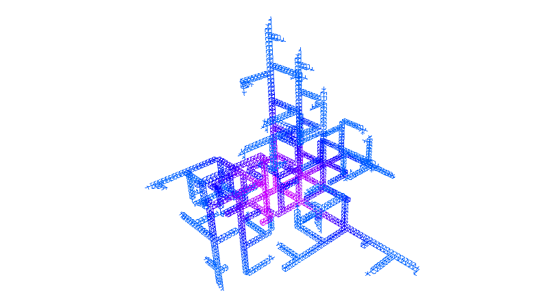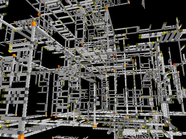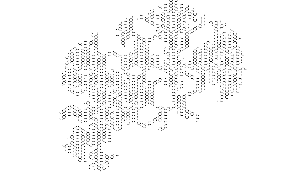 void setup(){ size(640, 480, IG.GL); IConfig.syncDrawAndDynamics=true; IG.bg(1.0); new ClockStackAgent(new IVec(0,0,0), new IVec(0,0,10), new IVec(0,-1,0), null, null).clr(0.2); } //... void rules(){ double rinc = 0.002; double ginc = 0.02; double ginc2 = 0.05; double binc = 0.004; if(clock(2)==1){ next(pitch(-PI/70), 0).clr(red(),green(),blue()+binc); } else if(clock(3)==1){ next(pitch(-PI/96).rot(-PI/96).roll(PI/6000), 0).clr(red(),green(),blue()+binc); } else if(clock(4)==1){ next(pitch(-PI*0.01475), 0).clr(red(),green(),blue()+binc); } else if(clock(5)==1){ next(rot(-PI*0.01545), 0).clr(red(),green(),blue()+binc); } else if(clock(6)==1){ if(clock(0)==5){ next(pitch(-PI/4-PI/10), 1).clr(red(),green()+ginc,blue()); if(clock(1)%5==0){ if(IRand.pct(1)){ next(pitch(PI/2).mul(0.5), 1).clr(red(),green()+ginc,blue()); } else if(IRand.pct(1)){ next(rot(PI/2).mul(0.5), 12).clr(red(),green()+ginc,blue()); } else if(IRand.pct(1)){ next(rot(-PI/2).mul(0.5), 12).clr(red(),green()+ginc,blue()); } else if(IRand.pct(0.5)){ next(mul(0.5), 11).clr(red(),green()+ginc,blue()); } } } else next(pitch(PI/20), 0).clr(red(),green(),blue()+binc); } else if(clock(7)==1){ next(pitch(-PI/58), 0).clr(red(),green(),blue()+binc); } else if(clock(8)==1){ if(clock(0)==5) next(rot(PI/4).pitch(-PI/58), 1).clr(red(),green()+ginc,blue()); else next(rot(-PI/20).pitch(-PI/58), 0).clr(red(),green(),blue()+binc); } else if(clock(9)==1){ if(clock(1)==0){ if(clock(0)==15) next(1).clr(red(),green(),blue()+binc*2); else next(0).delay(0).clr(red(),green(),blue()+binc*2); } else{ next(pitch(-PI/35).mul(0.99), 0).clr(red(),green(),blue()+binc*2); } } else if(clock(10)==1){ if(clock(1)==0){ next(pitch(-PI/2), 1).clr(red(),green()+ginc,blue()); } } else if(clock(11)==1){ if(clock(0)<35) next(0).clr(red(),green()+ginc,blue()); next(rot(PI/2).mul(1+0.08*cos(2*PI*clock(0)/35)), 9).clr(red(),green()+ginc2,blue()); next(rot(-PI/2).mul(1+0.08*cos(2*PI*clock(0)/35)), 9).delay(25).clr(red(),green()+ginc2,blue()); } else{ if(clock(1)==0){ if(clock(0)==2){ next(pitch(-PI/4), 1).clr(red(),green()+ginc,blue()); } else next(0).clr(red()+rinc,green(),blue()); next(rot(PI/2).pitch(-PI/120), 2).clr(red(),green()+ginc2,blue()); } else if(clock(1)==1){ if(clock(0)==8) next(pitch(PI/4), 1).clr(red(),green()+ginc,blue()); else next(mul(0.97),0).clr(red()+rinc,green(),blue()); next(rot(PI/2-PI/192).pitch(-PI/192), 3).clr(red(),green()+ginc2,blue()); } else if(clock(1)==2){ if(clock(0)==2){ next(pitch(-PI/2), 0).clr(red()+rinc,green(),blue()); next(rot(PI/2).pitch(-PI*0.01475/2), 4).clr(red(),green()+ginc2,blue()); } else if(clock(0)==3){ next(pitch(PI/2).mul(1.114), 1).clr(red(),green()+ginc,blue()); next(mul(0.954), 0).clr(red()+rinc,green(),blue()); next(rot(PI/2-PI*0.01545/2), 5).clr(red(),green()+ginc2,blue()); } else if(clock(0)==4){ next(rot(PI/2-PI*0.01545/2), 5).clr(red(),green()+ginc2,blue()); } else{ next(0).clr(red()+rinc,green(),blue()); next(rot(PI/2).pitch(-PI*0.01475/2), 4).clr(red(),green()+ginc2,blue()); } } else if(clock(1)==3){ if(clock(0)>=260) next(1).clr(red(),green()+ginc,blue()); else{ next(mul(0.997), 0).clr(red()+rinc,green(),blue()); if(IRand.pct(1)){ if(IRand.pct(50)){ next(pitch(PI/4).mul(0.7), 0).clr(red()+rinc,green(),blue()); } else{ next(pitch(-PI/4).mul(0.7), 0).clr(red()+rinc,green(),blue()); } } } if(IRand.pct(80)){ next(rot(PI/2).pitch(-PI/6-PI/120), 6).clr(red(),green()+ginc2,blue()); } else{ next(rot(PI/2).pitch(-PI/6-PI/120).mul(0.5), 6).clr(red(),green()+ginc2,blue()); } } else if(clock(1)==4){ if(clock(0)==7) next(1).clr(red(),green()+ginc,blue()); else next(0).clr(red()+rinc,green(),blue()); next(rot(PI/2).pitch(-PI/120), 7).clr(red(),green()+ginc2,blue()); } else if(clock(1)==5){ next(1).clr(red(),green()+ginc,blue()); } else if(clock(1)==6){ if(clock(0)==6) next(1).clr(red(),green()+ginc,blue()); else next(0).clr(red()+rinc,green(),blue()); next(rot(PI/2).pitch(-PI/120).rot(PI/8), 8).clr(red(),green()+ginc2,blue()); } else if(clock(1)==7){ if(clock(0)==4){ next(pitch(-PI/2), 11).clr(red(),green()+ginc,blue()); } else next(0).clr(red()+rinc,green(),blue()); } } }