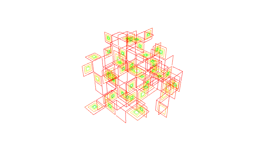 void rules(){ if(clock(0)==10){ if(clock(1)==0){ if(clock(2)==0){ next(pitch(PI/2).roll(-PI/2), 2); } else{ next(pitch(-PI/2).roll(PI/2), 3); } } if(clock(1)==20); // stop else{ if(clock(1)==0 || clock(1)==1){ if(clock(1)==1 && clock(3)==1){ next(4); } next(yaw(PI/2), 1).hsb(clock(1)*0.02,1,1); } else{ next(yaw(PI/2).mul(0.9), 1).hsb(clock(1)*0.02,1,1); } } } else{ next(0); } }