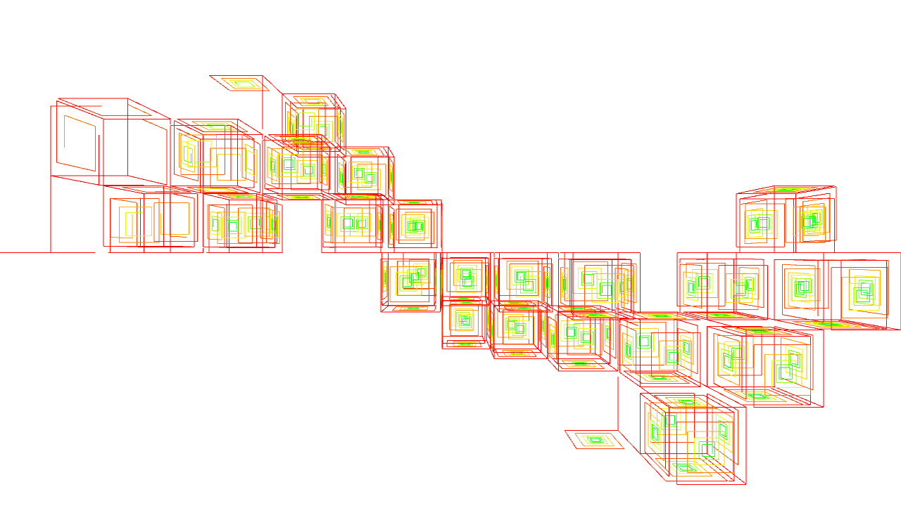 void rules(){ if(clock(0)==10){ if(clock(1)==0){ if(clock(2)==0){ if(clock(3)==2){ next(pitch(PI/2).roll(PI/2).mul(0.9), 2); next(yaw(-PI/2), 4); // new cube } else{ next(pitch(PI/2).roll(PI/2), 2); if(clock(4)==4 && clock(3)==1){ next(yaw(-PI/2), 5); // new cube } } } else{ next(pitch(-PI/2).roll(-PI/2), 3); } } if(clock(1)==20); // stop else{ next(yaw(PI/2).mul(0.9), 1).hsb(clock(1)*0.02,1,1); } } else{ next(0); } }