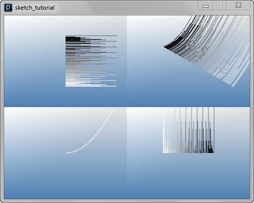 import processing.opengl.*; import igeo.*; size( 480, 360, IG.GL ); ArrayList < ArrayList < IVec > > ptlist2 = new ArrayList < ArrayList < IVec > >(); for(int i=0; i < 100; i++ ){ // needs to make a child list individually ArrayList < IVec > childList = new ArrayList < IVec >(); int num = 0; if( i%11 == 0 ){ num = 110; } else if( i%8 == 0 ){ num = 80; } else if( i%7 == 0 ){ num = 70; } else if( i%5 == 0 ){ num = 50; } else if( i%4 == 0 ){ num = 40; } else if( i%3 == 0 ){ num = 30; } else if( i%2 == 0 ){ num = 20; } for(int j=0; j < num; j++){ childList.add( new IVec( j, 50-i, j*j*0.01 ) ); } // add the child list to the parent (ptlist2) ptlist2.add(childList); } // create curves for(int i=0; i < ptlist2.size(); i++){ // don't create curve if number of points is less than 2 if( ptlist2.get(i).size() > 1 ){ IVec[] fixedArray = ptlist2.get(i).toArray(new IVec[ptlist2.get(i).size()]); new ICurve(fixedArray).clr(i*0.01); } }